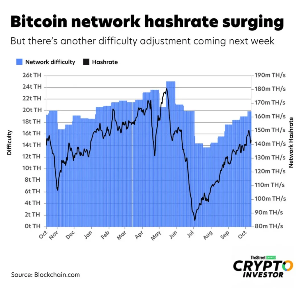 Current change Bitcoin’s network difficulty rose 5.97% to 150.84 trillion.